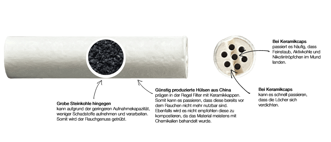 We recommend the most modern activated carbon filters with open-pored cellulose closures and fine coconut activated carbon. Not only are they environmentally neutral and made in Germany, but they also provide smoking pleasure with fewer pollutants.