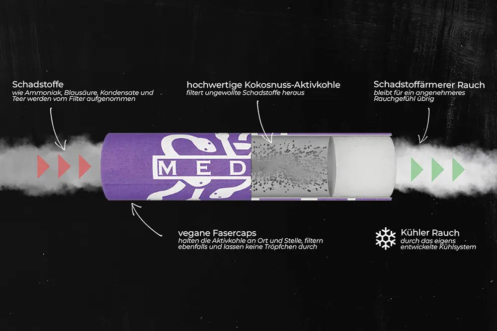 However, carbon filters show their best results when used in a joint. Here, large areas of pollutants from tobacco smoke and the combustion process are removed, while most of the cannabis ingredients can pass through the filter undisturbed. This offers the consumer the advantage of a significantly improved smoking experience. In addition, the taste is not distorted by activated carbon filters with open-pored cellulose closures, such as the "Medusa filter", as no activated carbon dust gets into the throat. Your lungs will thank you. You can find out what makes the perfect activated carbon filter here .