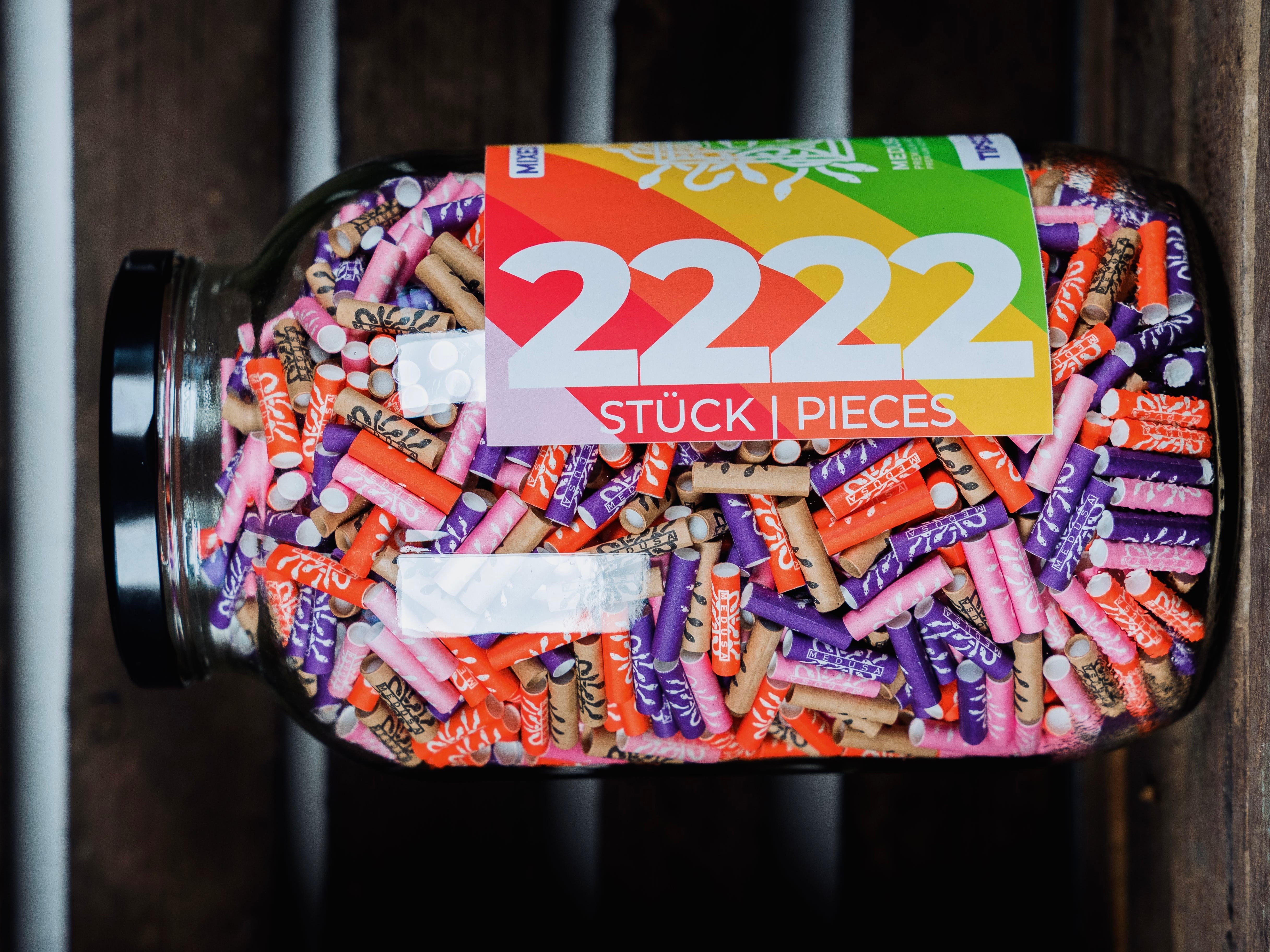 🎨 Entdecke das Medusafilters 2222er Glas – Dein Jahresvorrat! In diesem Glas findest du 2222 Aktivkohlefilter in den Farben ORGANIC, VIOLET, SUNSET und ROSÉ, alle in der beliebten 6 mm Tip Size. Perfekt für diejenigen, die Vielfalt und Qualität schätzen.